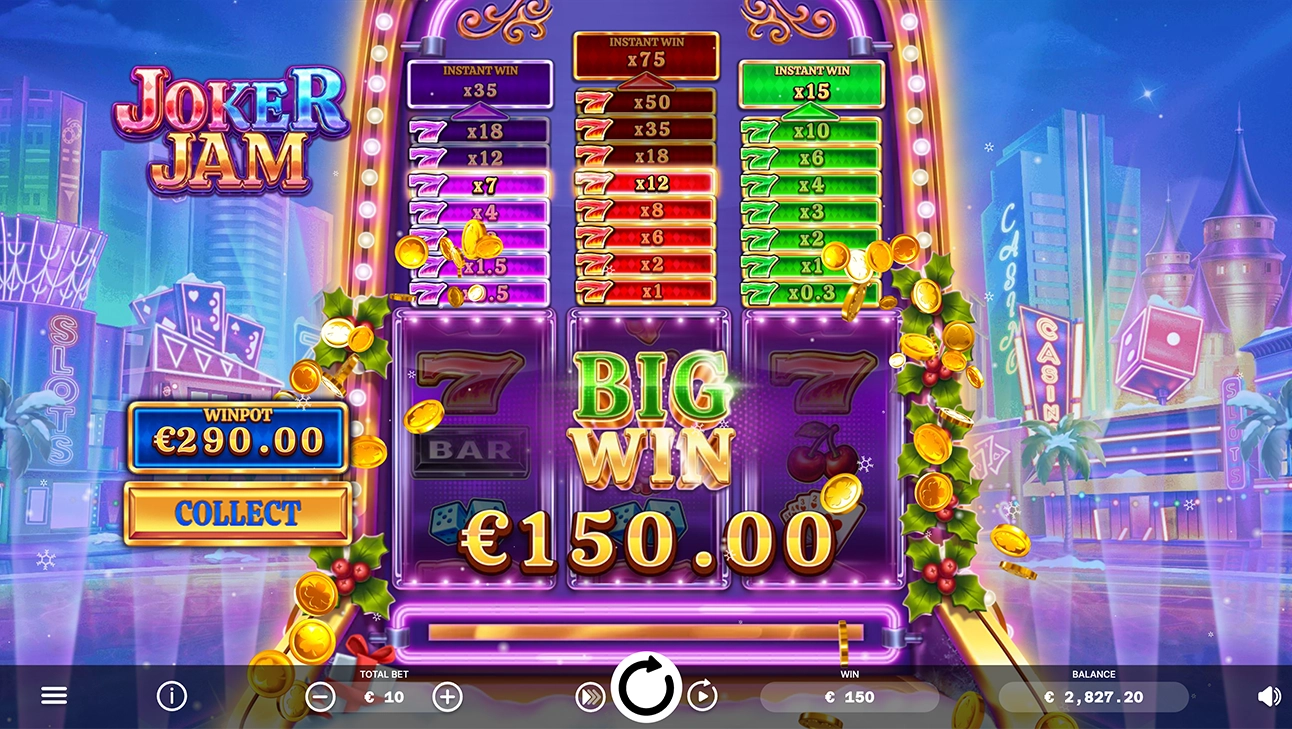 Under the neon glow of the city, the reels spin with classic energy — sevens, fruits, and rising Winpots with every hit. The Lucky Joker adds boosts and bright rewards, keeping the streak alive. But beware the Bad Joker: once he appears, the game ends and your winnings vanish. Only the bold cash out before the darkness arrives.
