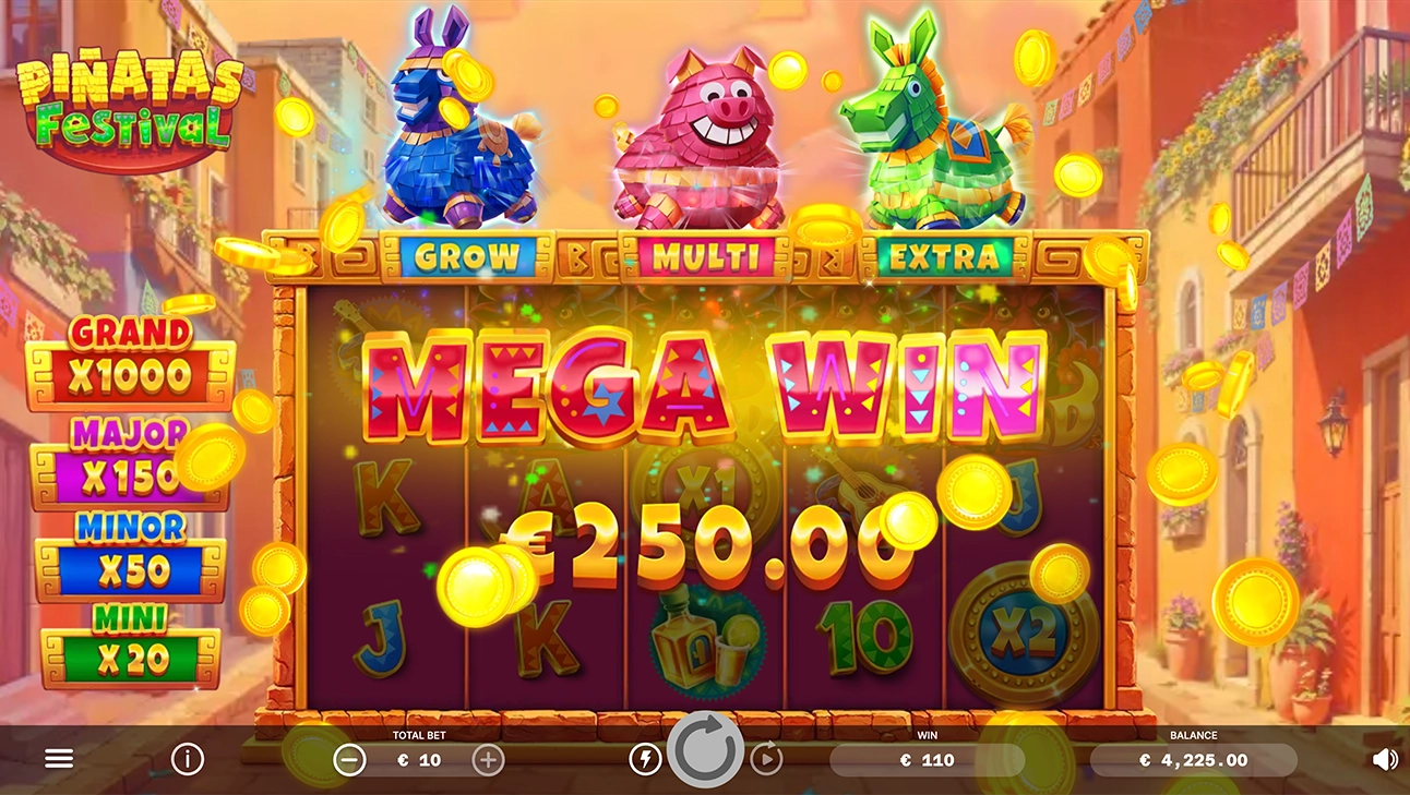 In the main game, the Collector Symbol gathers all coin prizes and powers piñatas until they burst with features. The Bonus Game — Hold & Win starts with 3 Respins (4 in Extra Respin). Colored coins trigger Grow Reels, Multipliers, or Extra Respins. Multiple features can combine for explosive wins!