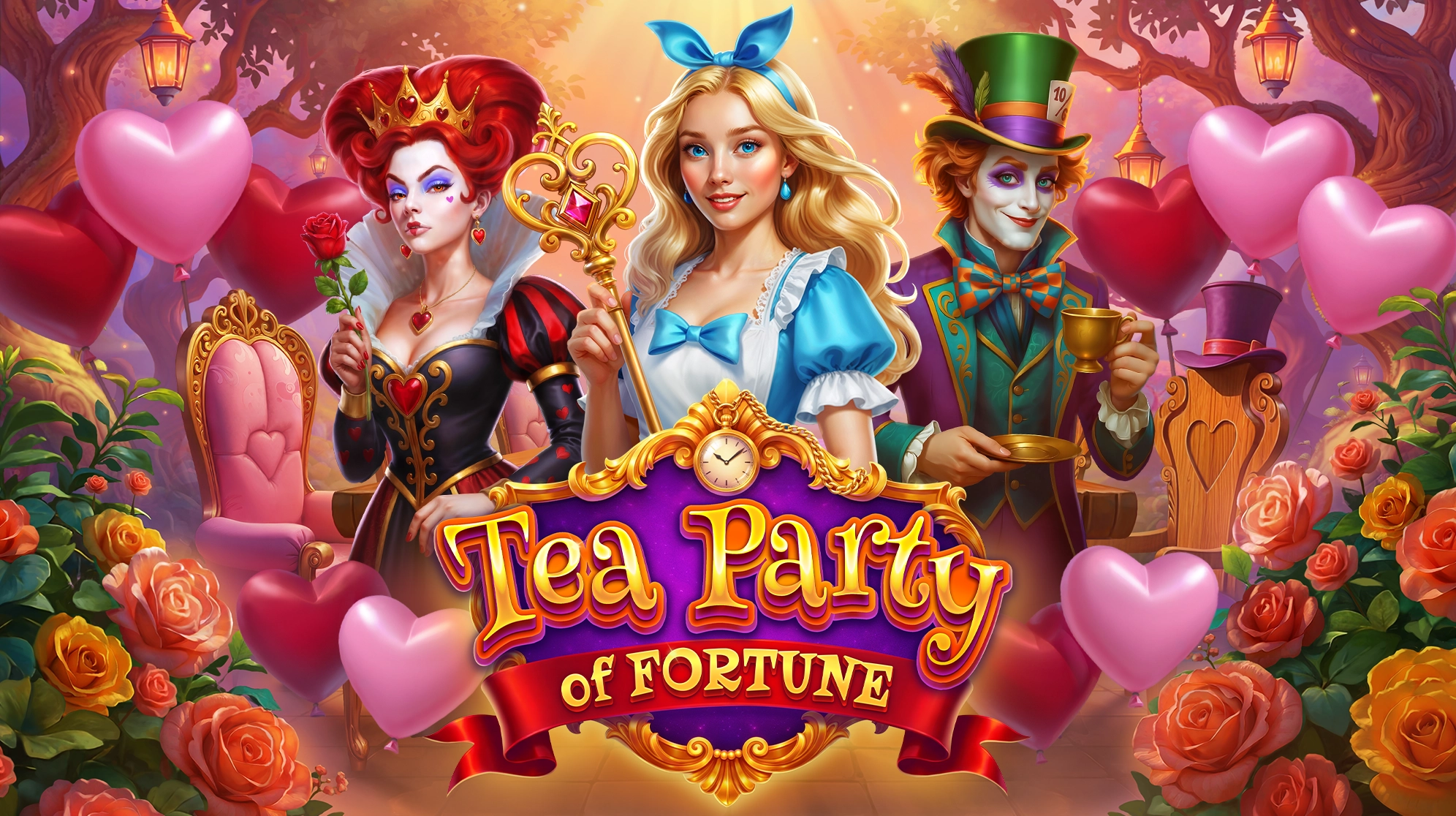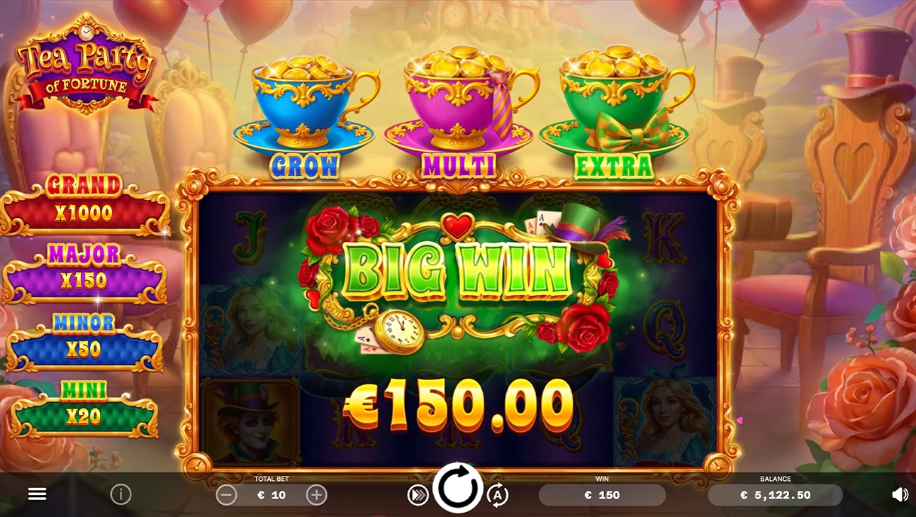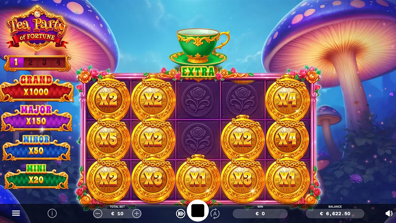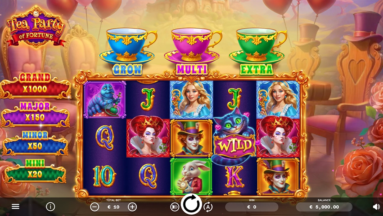 In the main game, Golden Teacups collect all Coin prizes until they overflow. The Hold & Win Bonus starts with 3 Respins (4 in the Extra Respin mode). Watch for magic tea-coins to trigger features: Curious Growth (5x5 expansion), Mad Multipliers, and Extra Respins. Best of all, features can combine for a whirlwind of massive, explosive wins!